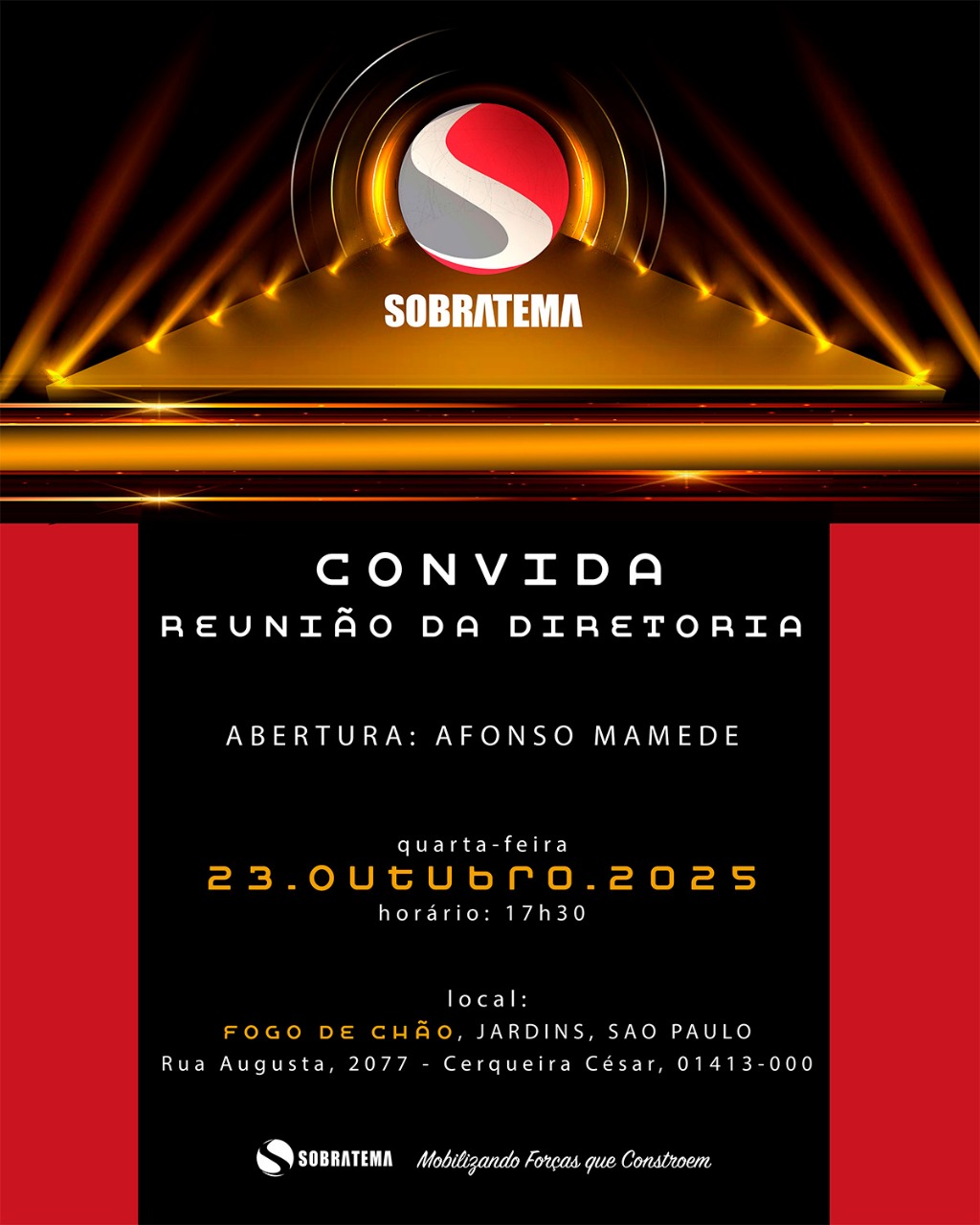 É com grande satisfação que a Sobratema convida para a próxima Reunião da Diretoria, um momento estratégico para alinharmos iniciativas, discutirmos tendências e definirmos os próximos passos rumo ao fortalecimento do setor.
